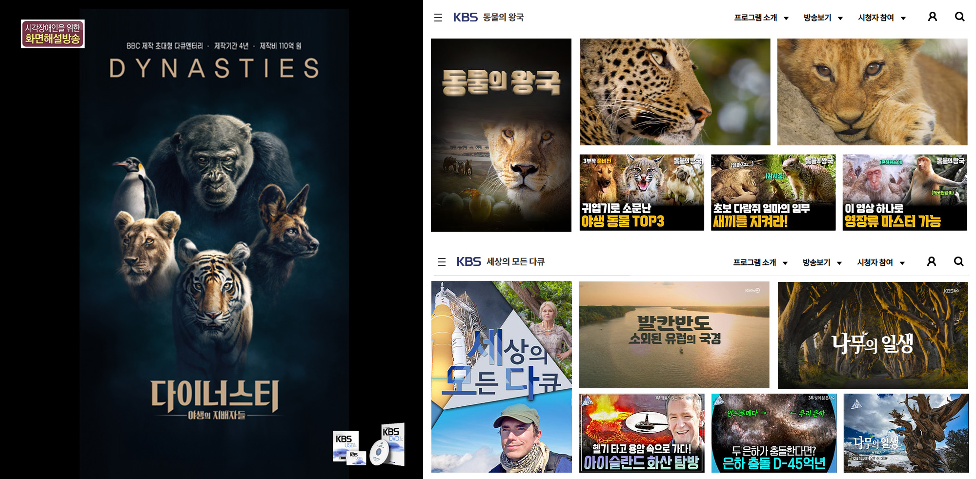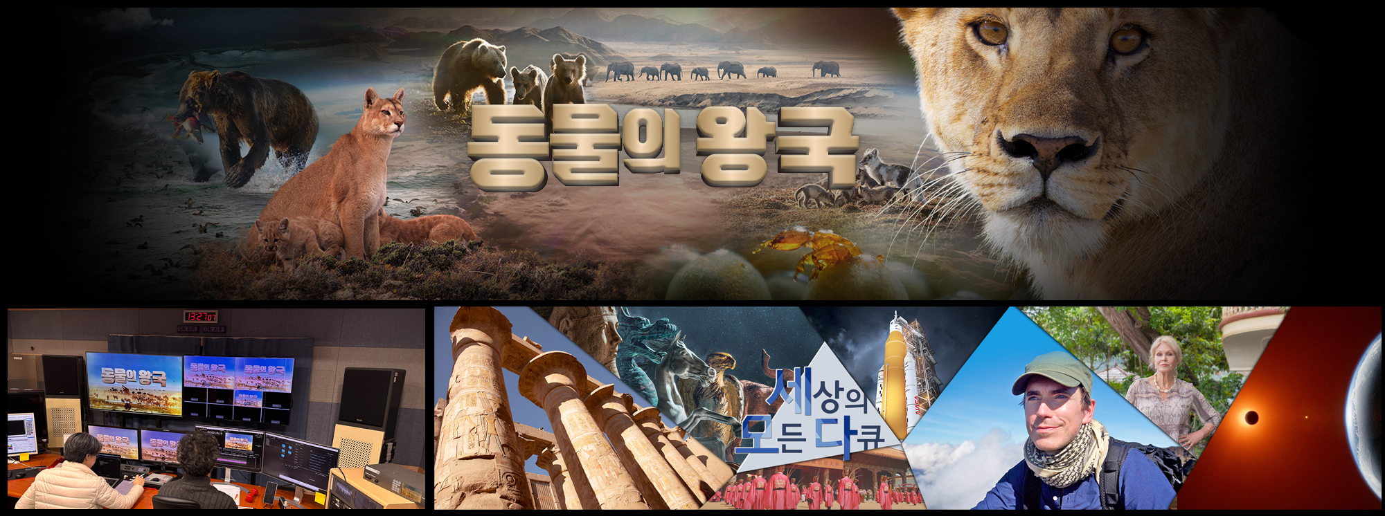 1991년 KBS미디어 설립의 근간이 된 외화 더빙 제작은 <명화극장>, <토요명화>, <동물의 세계>를 시작으로, 현재는 <동물의 왕국>과 <세상의 모든 다큐>의 정규 프로그램과 BBC, NHK, ZDF 등 주요 공영방송사의 다큐를 제작사의 작품을 <특선 다큐>로 제작합니다.