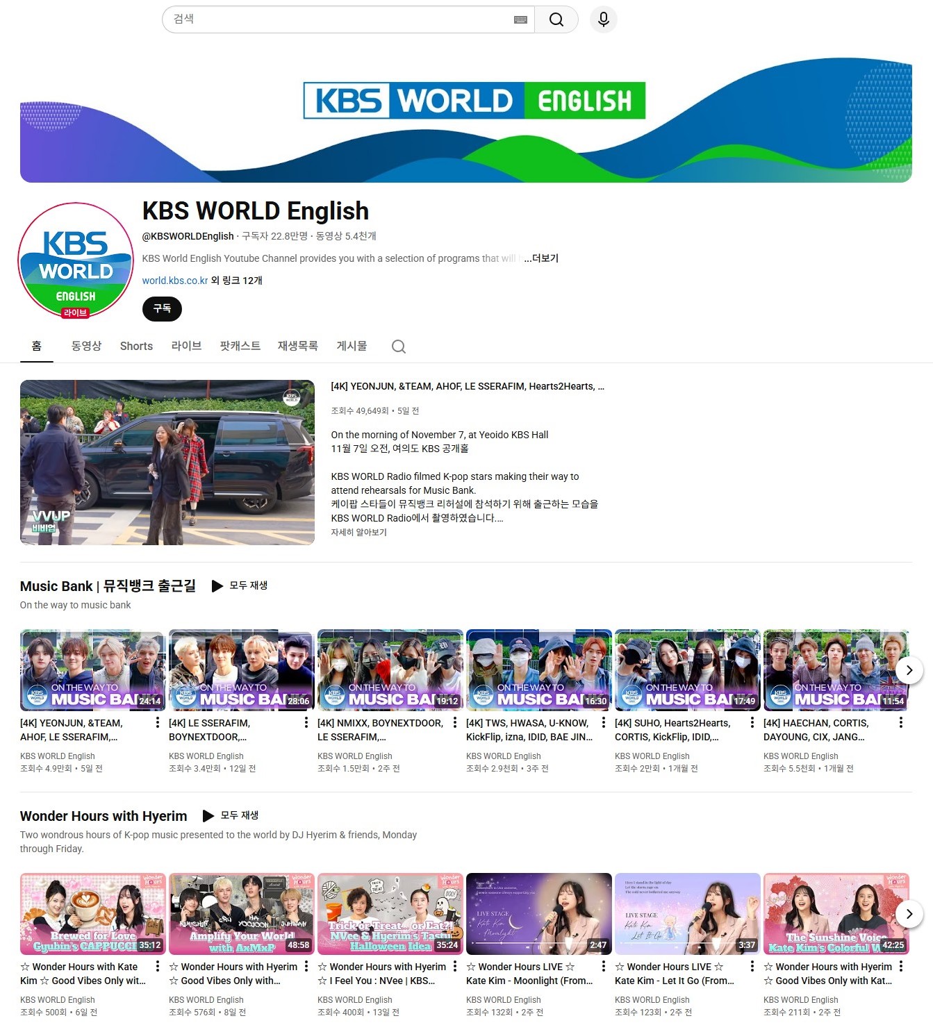 KBS WORLD English 유튜브 채널을 운영하며 '뮤직뱅크 출근길', '아이컨택캠' 등 오리지널 콘텐츠를 제작·운영하고 있습니다. 채널 운영 과정에서 기획·촬영·편집·업로드 등 제작 전반을 관리하고, 글로벌 시청자 대상 제공을 위해 영어 자막 및 운영 체계를 유지하고 있습니다.