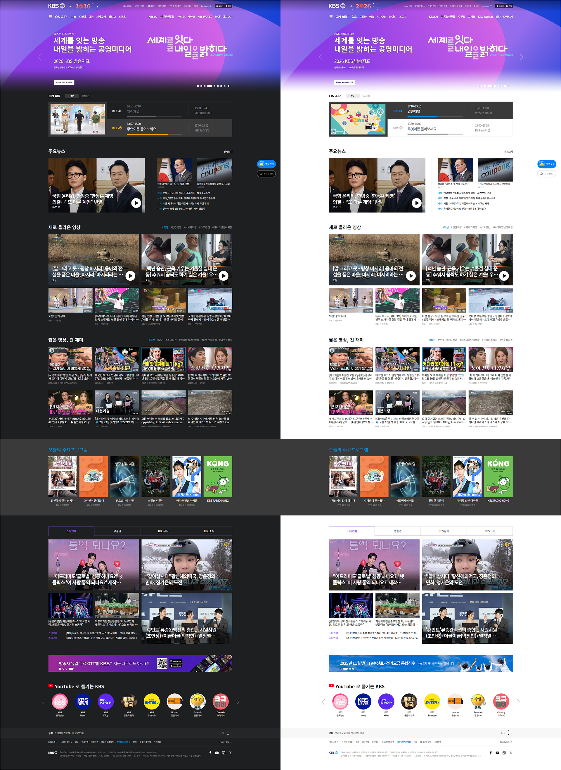 급변하는 미디어 트렌드 속에서도 웹 접근성 표준 준수와 디지털 포용성을 엄격히 실천하며, 시청자의 목소리가 서비스에 반영될 수 있도록 소통의 장을 지속적으로 확대하고 있습니다. 신뢰를 바탕으로 한 고품격 콘텐츠가 모든 이에게 평등하게 전달될 수 있도록, 기술적 혁신과 공적 책무를 결합한 미래 지향적 공영 미디어 생태계를 설계해 나갑니다.