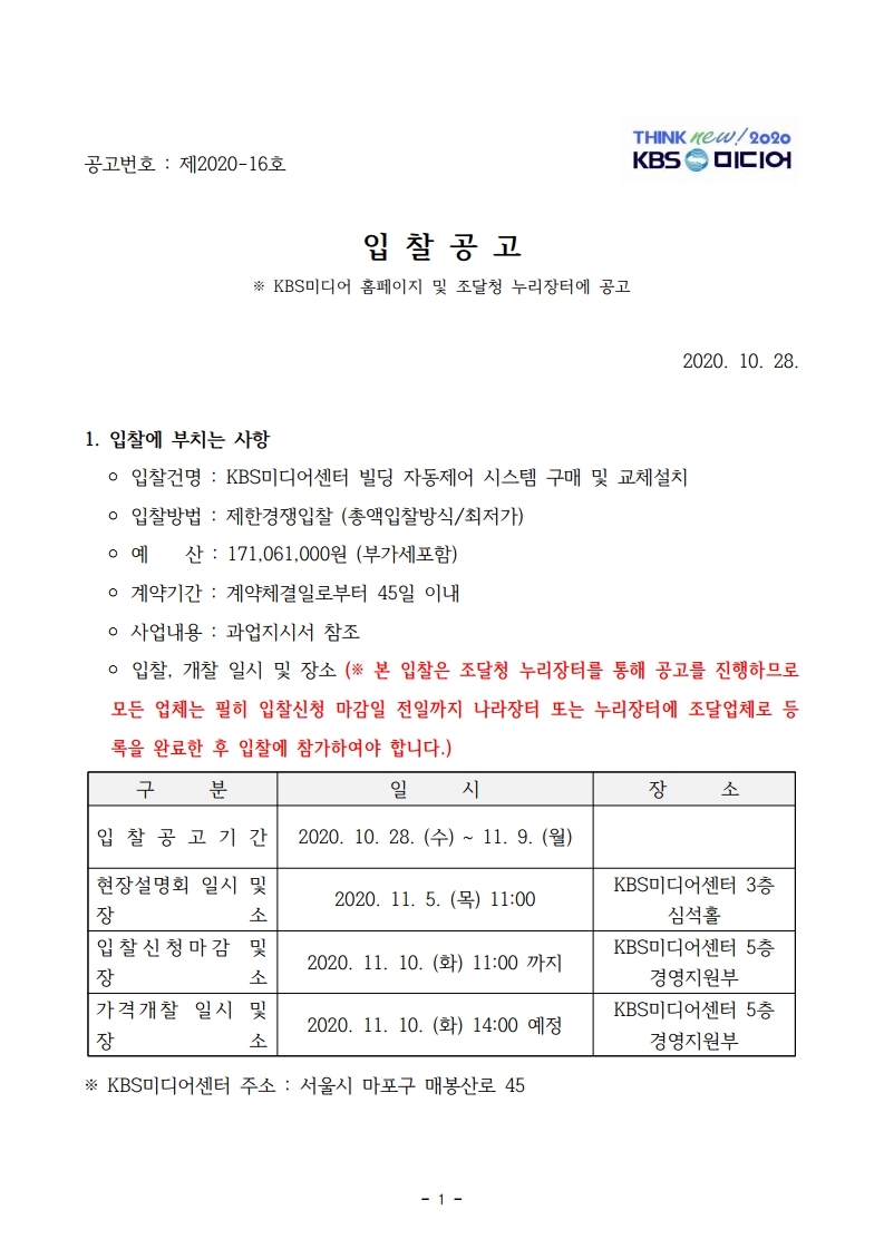 [입찰공고] KBS미디어센터 빌딩 자동제어 시스템 구매 및 교체설치