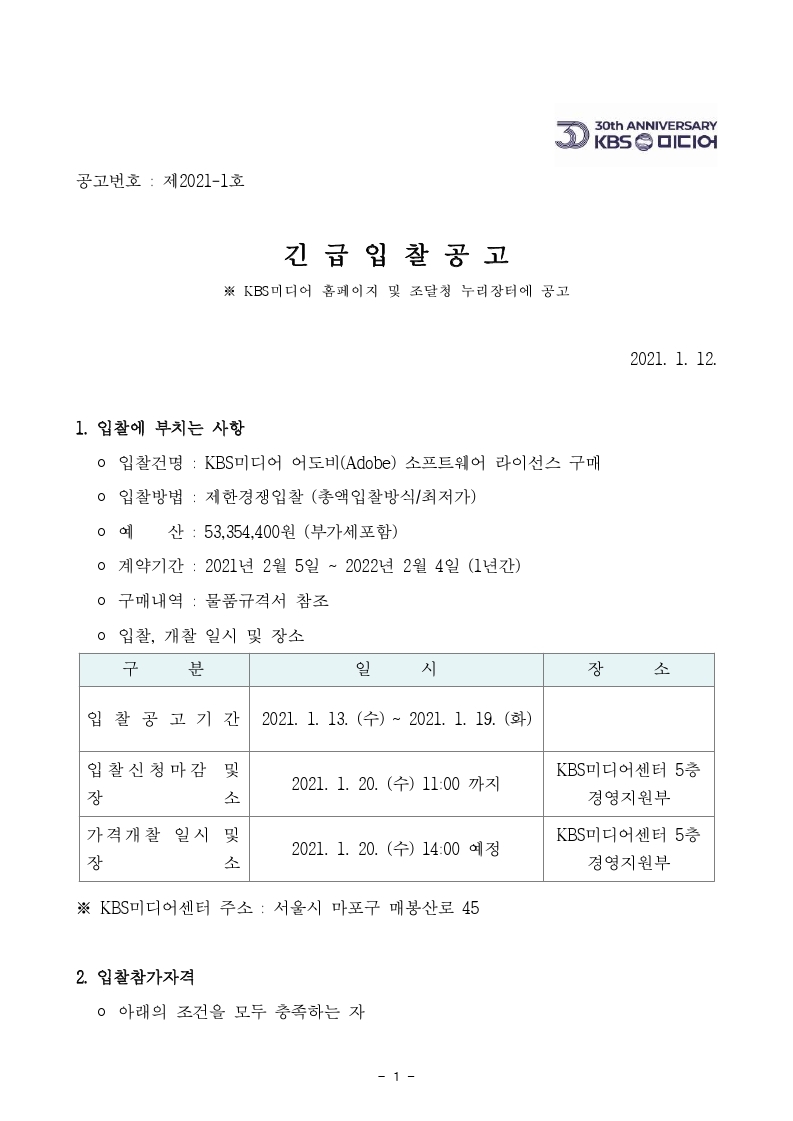 [긴급입찰공고] KBS미디어 어도비(Adobe) 소프트웨어 라이선스 구매