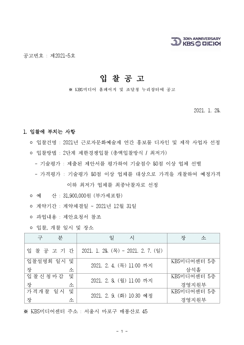 [긴급입찰공고] 2021년 근로자문화예술제 연간 홍보물 디자인 및 제작 사업자 선정