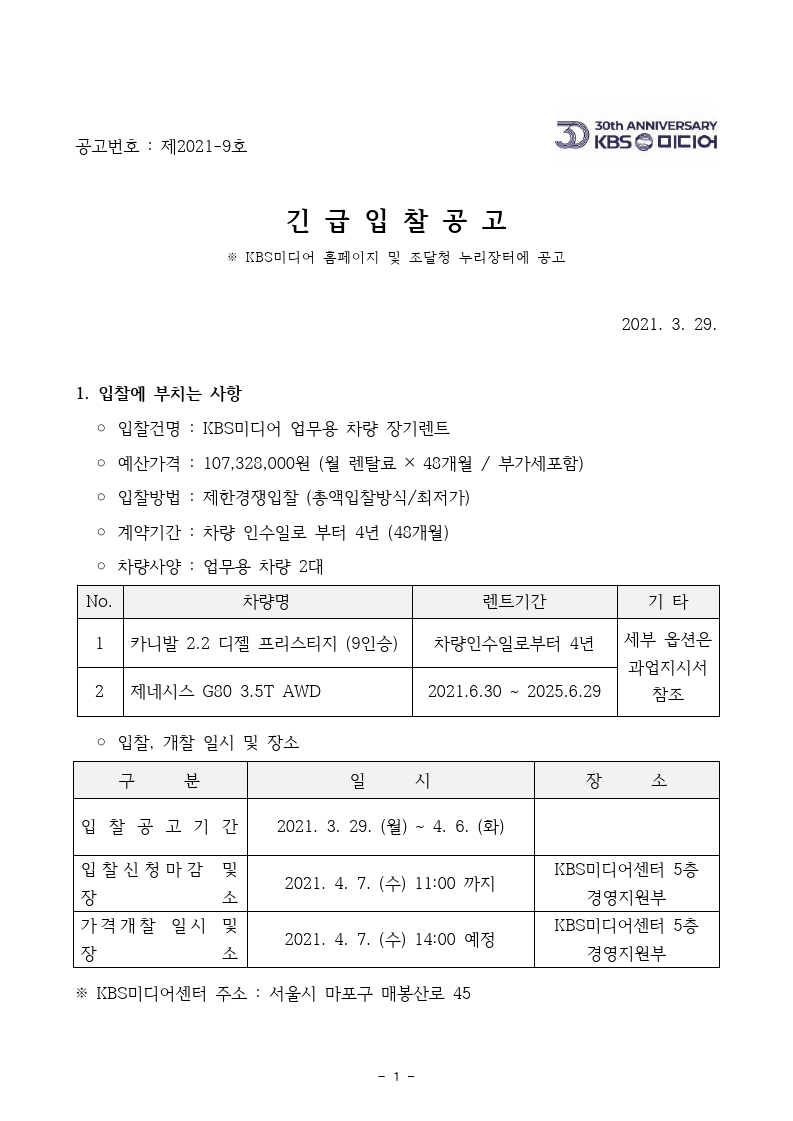 [긴급입찰공고] KBS미디어 업무용 차량 장기렌트 (차량추가)