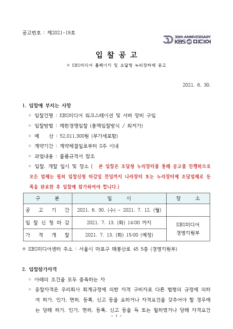 [입찰공고] KBS미디어 워크스테이션 및 서버 장비 구입