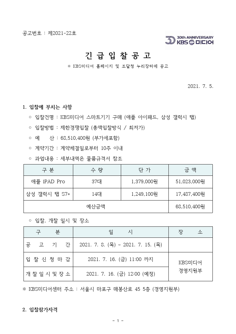 [긴급입찰공고] KBS미디어 스마트기기 구매 (애플 아이패드, 삼성 갤럭시 탭)