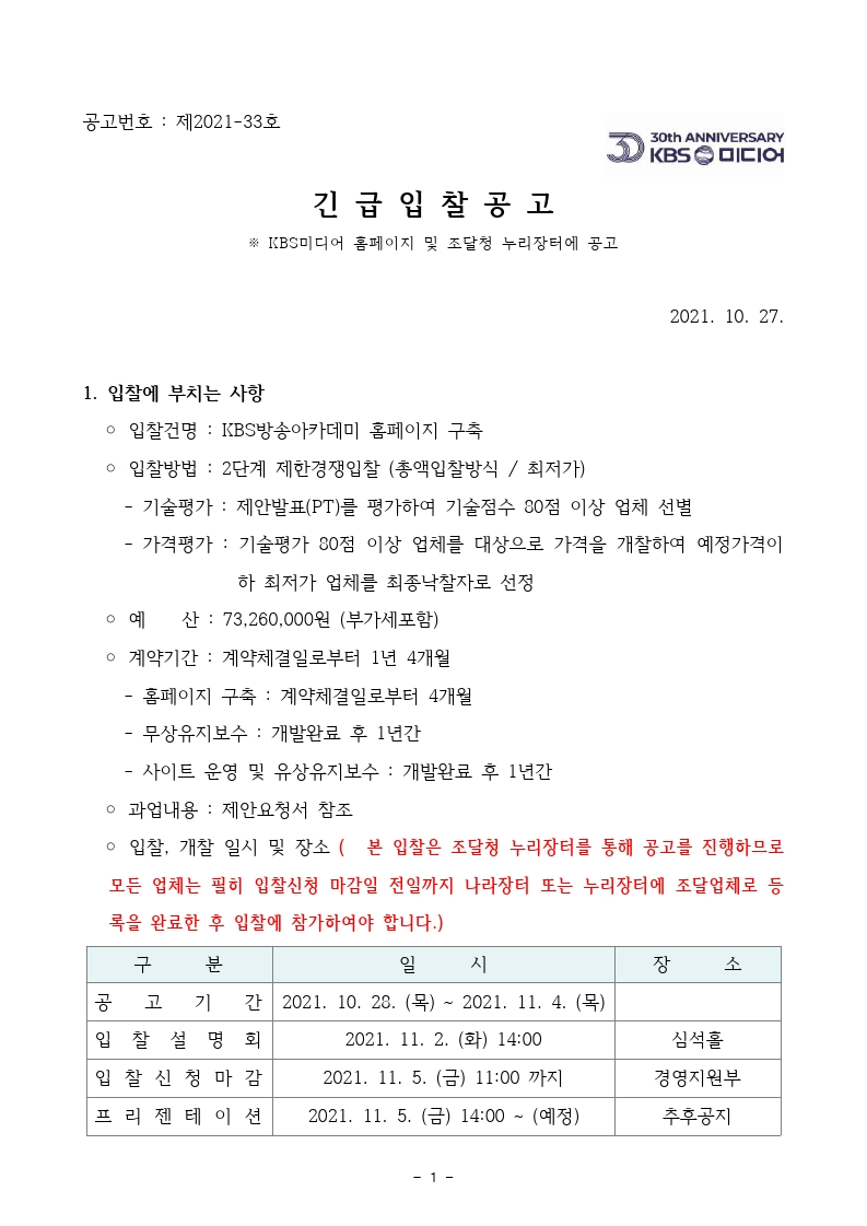 [긴급입찰공고] KBS방송아카데미 홈페이지 구축 (재공고)