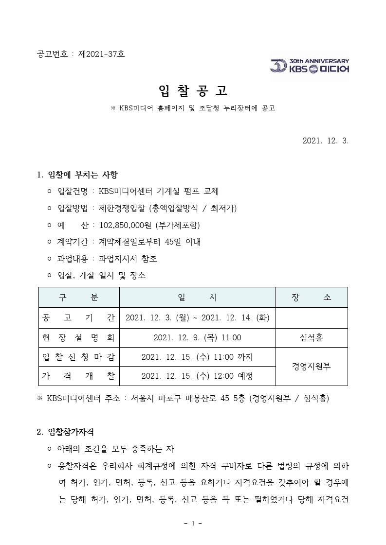 [입찰공고] KBS미디어센터 기계실 펌프 교체