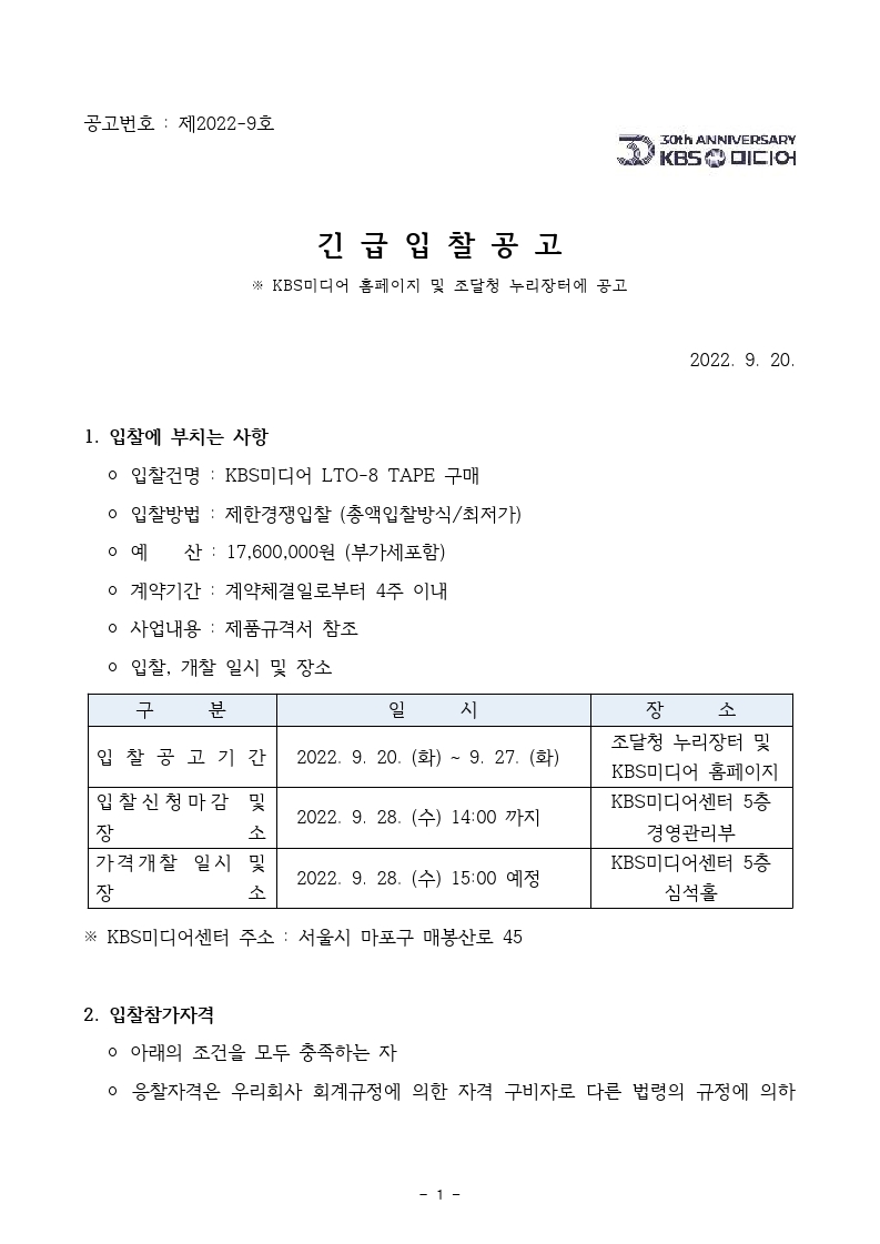 [긴급입찰공고] KBS미디어 LTO-8 TAPE 구매