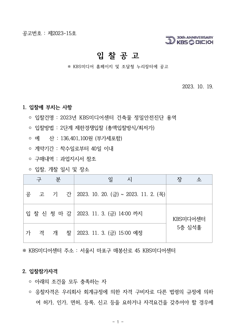 2023년 KBS미디어센터 건축물 정밀안전진단 용역