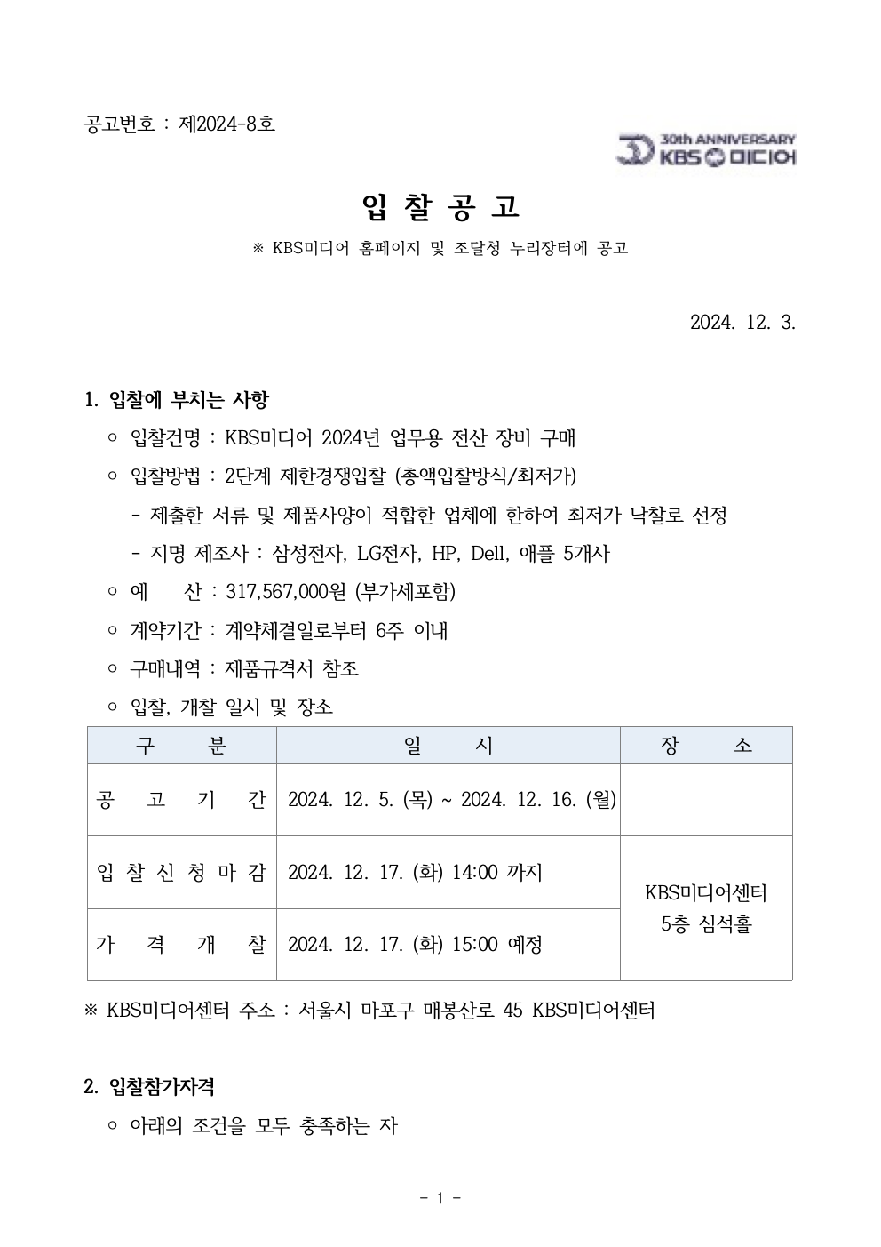 [재공고] KBS미디어센터 전력용 디지털보호계전기(GIPAM) 교체