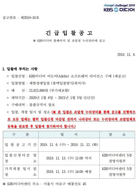 [긴급입찰공고] KBS미디어 어도비(Adobe) 소프트웨어 라이선스 구매 (재공고)