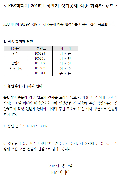 2019년 상반기 신입사원 정기공채 최종 합격자 공고