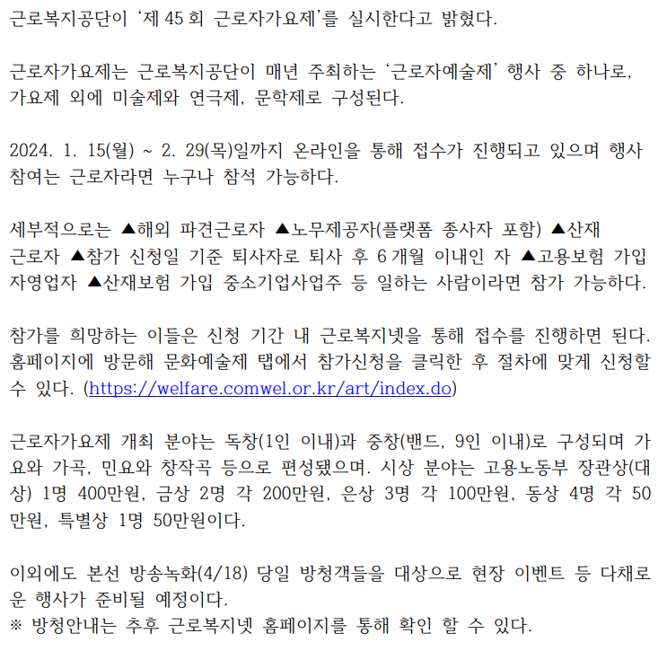 제 45회 근로자 가요제 개최