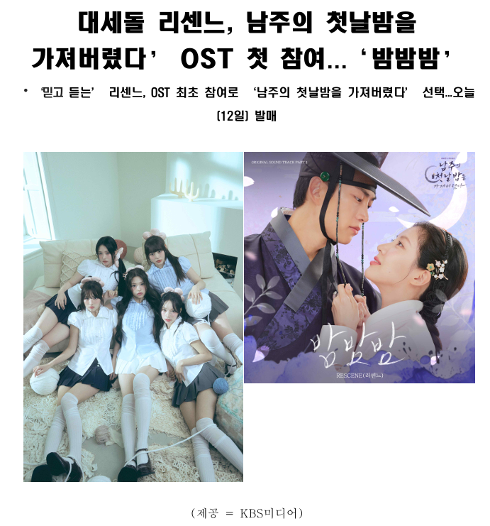 한편, 리센느가 참여한 ‘남주의 첫날밤을 가져버렸다’ OST Part.1 ‘밤밤밤’은 오늘 (12일) 12시에 멜론, 스포티파이 등 각종 음원 플랫폼을 통해 공개된다.